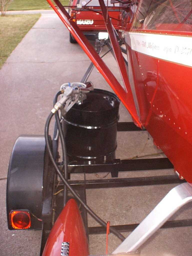 The picture should show that a 18 gallon tank, DOT rated fuel pump (13 gallons per min.) and related welding for under 300 bucks. The concept really takes away alot of fueling troubles. Adding a 12 volt motorcycle battery mounted on the trailer allows stand alone independence from the auto. Coordination of the tank location is a key factor which will not hinder the loading and unloading of the plane. Prior to my creation, I had to use my 6 ft step ladder and 2 - 6 gallon containers of fuel (slow operation), and tiring.