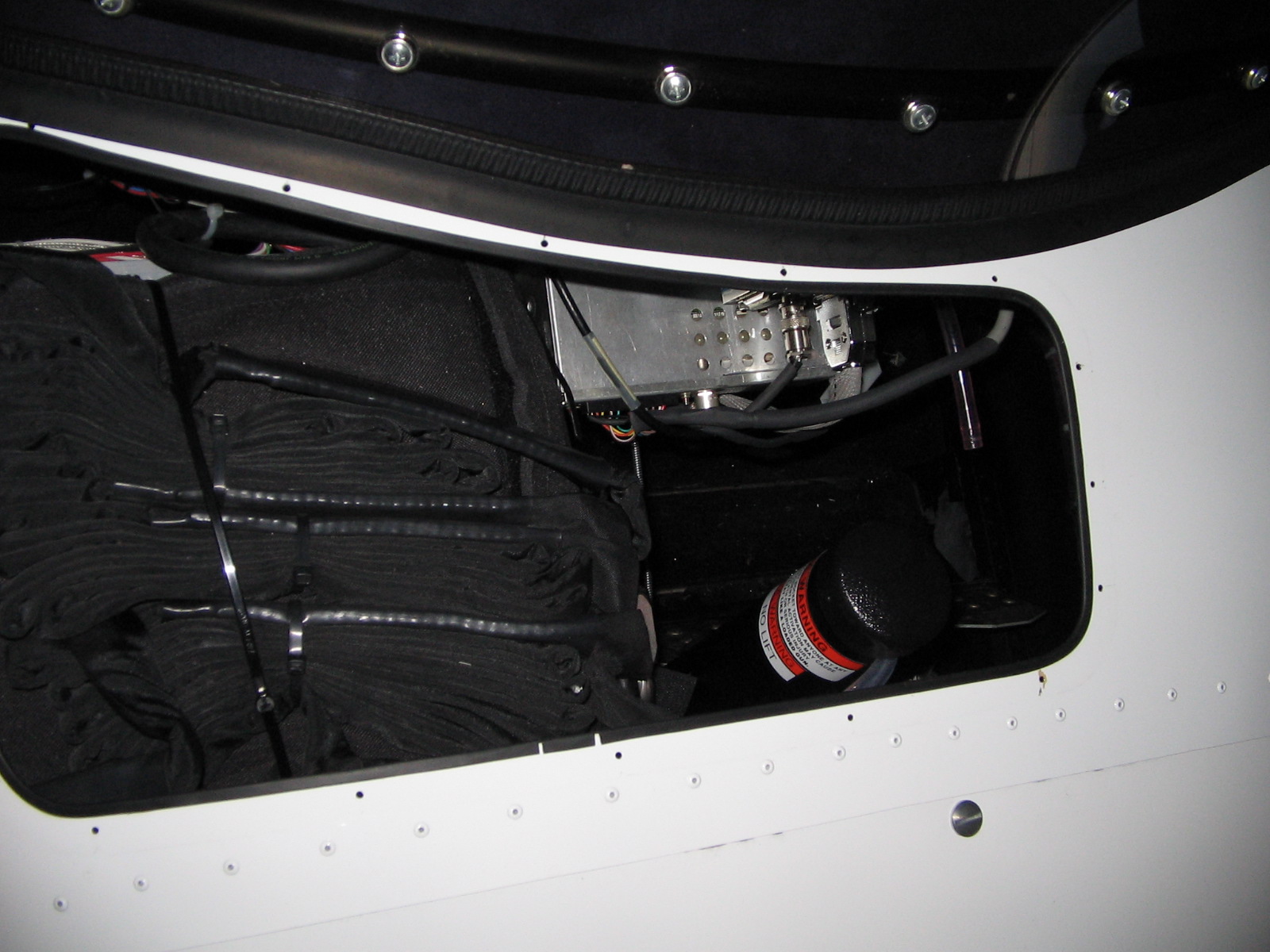The rear portion of the canopy would be in the way if the BRS were mounted in the baggage area (assuming usage of the 650 canopy), which is one reason why I want to put my BRS up front. The bracket that the rocket tube is mounted on is bolted to the cabin side of the firewall, and the rocket fires up through a frangible cover on the center-front portion of the forward top skin (ahead of the front of the canopy).