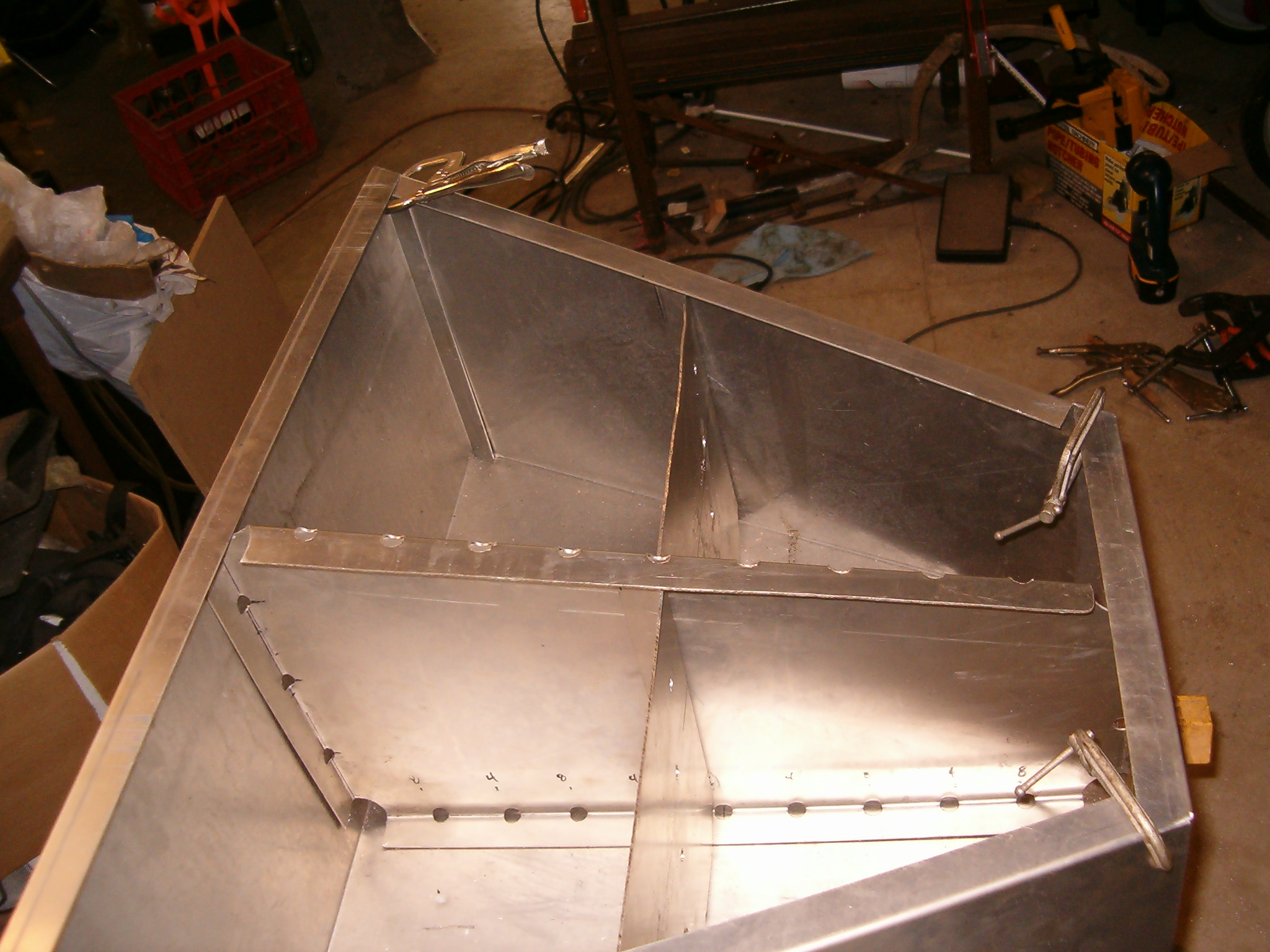 If you notice, there are only vertical seams and seams on the top. I haven't decided on the extent I will rivet. Each vertical seam can be welded on the inside and outside. May only use rivets to the attach the top to the long baffle down the center and then weld over them.