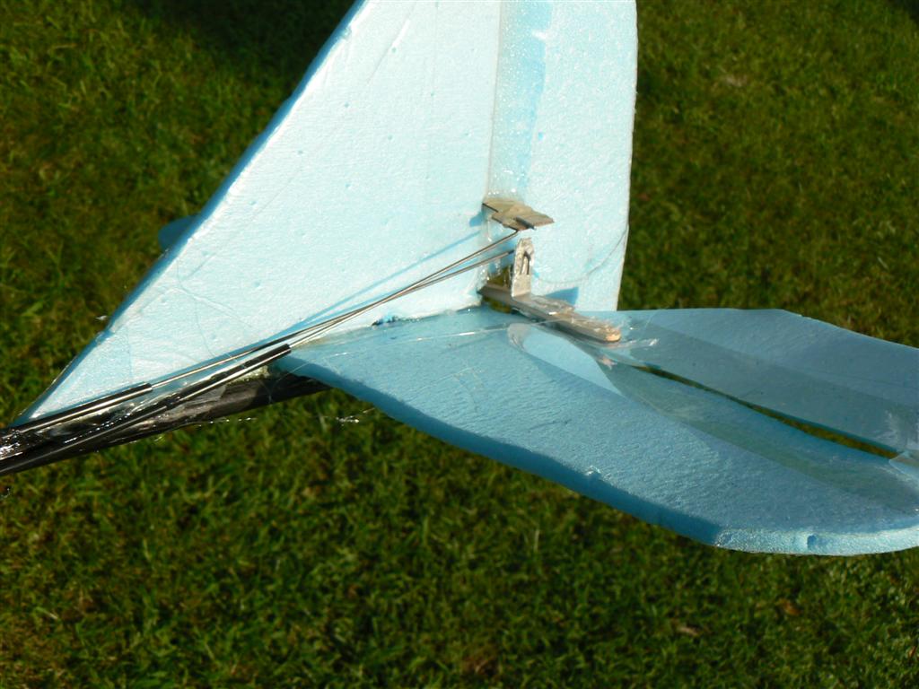 | Popsicle stick elevator connector. 1/32" plywood horns. Coffee stirrer push rod guides. |